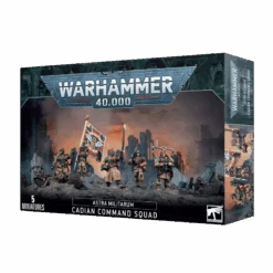 Ce kit plastique permet d’assembler une Escouade de Commandement Cadienne, composée d’un Commandeur Cadien et de quatre Gardes Impériaux Vétérans. Le Commandeur Cadien est armé, selon votre choix, d’un pistolet laser, d’un pistolet bolter ou d’un pistolet à plasma dans une main et d’une épée tronçonneuse, d’une épée énergétique ou d’un gantelet énergétique dans l’autre. Chacun des Vétérans qui l’accompagnent porte un équipement différent : un médic de terrain avec un fusil laser et un médipac ; un opérateur vox avec un pistolet laser et un vox de maître ; un garde du corps avec un pistolet laser et, au choix, une épée tronçonneuse, une épée énergétique ou un gantelet énergétique ; et un porte-étendard avec un fusil laser et un étendard régimentaire. Le garde du corps et le porte-bannière peuvent à la place être assemblés avec une arme spéciale : un lance-flammes, un lance-grenades, un fuseur ou un fusil à plasma.