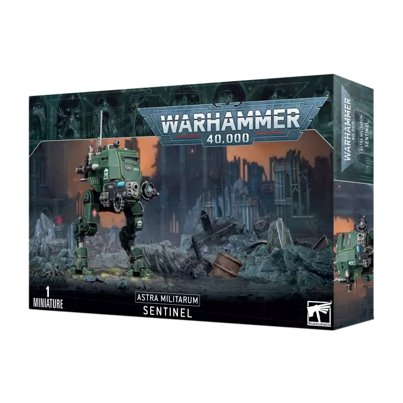 Ce kit plastique permet d’assembler un Sentinel Blindé, un marcheur léger doté d’une grande puissance de feu sur un châssis robuste. Ce kit dispose de tout un tas d’options, ce qui vous permet d’équiper votre Sentinel pour répondre aux exigences de n’importe quel champ de bataille avec un autocanon, un lance-flammes lourd, un lance-missiles, un multi-laser ou un canon à plasma. Vous pouvez également équiper votre marcheur d’une tronçonneuse Sentinel orientable pour une plus grande efficacité en combat rapproché, ainsi que d’un missile traqueur pour renforcer encore sa puissance de feu. Vous trouverez également de nombreuses options esthétiques, comme un projecteur et des lanceurs de fumigènes, des arrimages et des râteliers d’équipement supplémentaires, des bidons de carburant supplémentaires.