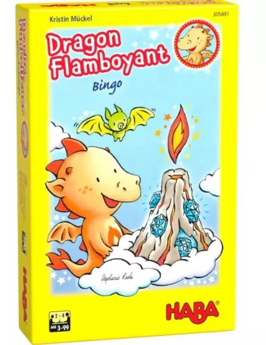 Avec le dragon Flamboyant et ses amis, les enfants partent à la découverte de volcans en éruptions, de mystérieuses cartes au trésor et plein d’autres choses lorsqu’ils retournent les tuiles. A chaque image découverte sur votre carton de bingo, vous posez une pierre « foudre ». Le premier qui en aligne quatre s’écrie « Bingo Dragon ! » et gagne la partie.