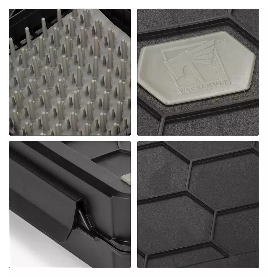 La mallette est garnie de picots de silicone flexibles qui s’emboîtent avec le couvercle et tiennent fermement vos figurines en place, ce qui les protège des dégâts. Les deux moitiés vous permettent d’en utiliser une comme contenant dans lequel placer vos figurines avant de fermer la mallette avec l’autre à l’aide des loquets sur les bords. Les deux moitiés possèdent une surface en caoutchouc pour les empêcher de glisser et de tomber.