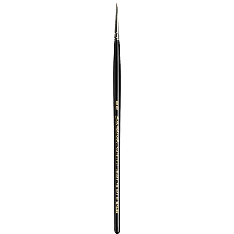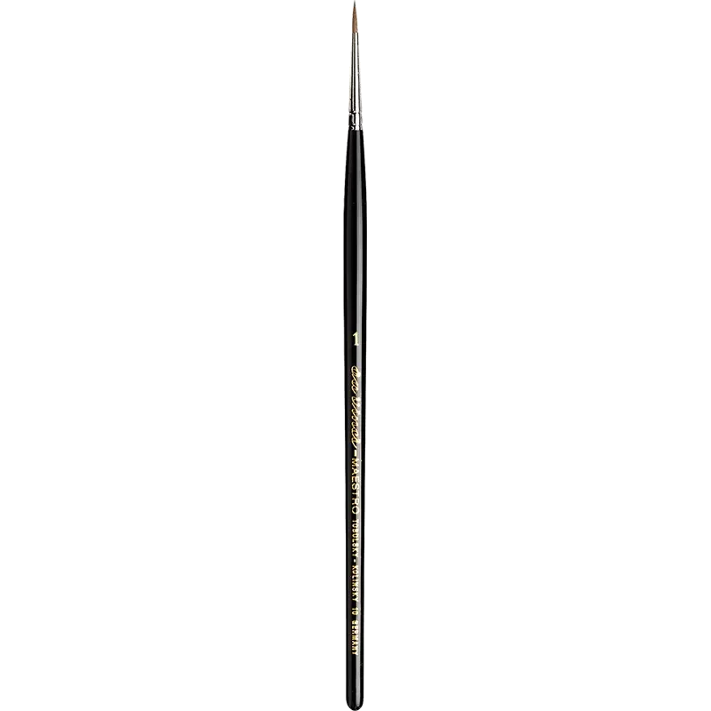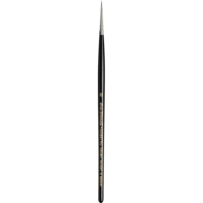 Pinceau à aquarelle “Maestro”, produit à partir de poils sélectionnés, provenant des queues hivernales de martres mâles rouges Kolinsky de Sibérie. Ce pinceau se caractérise par une pointe spécialement fine, un corps très souple et un manche court vernis noir.