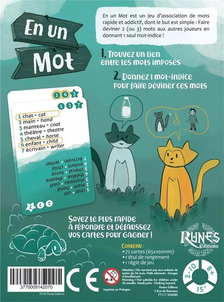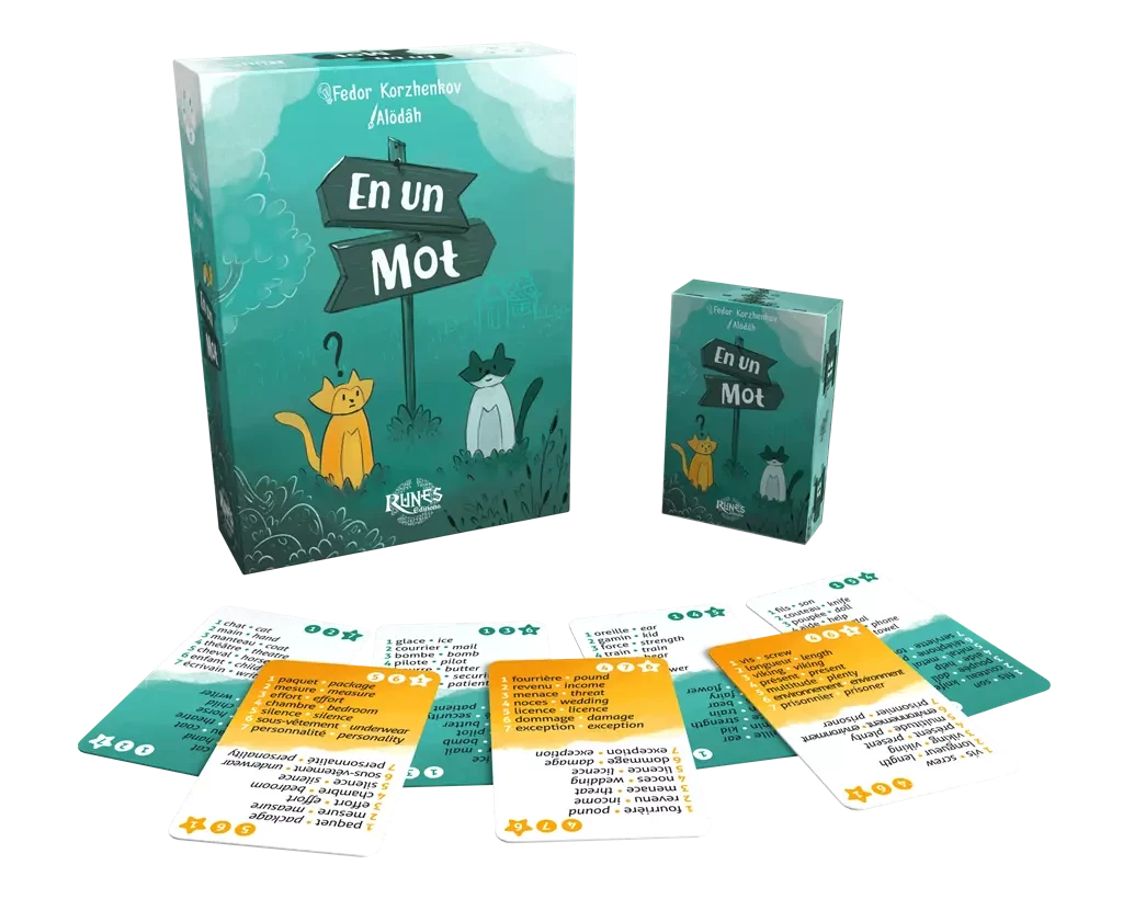De plus, sur chaque carte, les mots sont écrits en français et en anglais. Vous pouvez jouer avec une seule langue, ou avec les deux langues. Dans ce cas, donnez le mot-indice dans une langue, et les joueurs doivent trouver les mots dans l’autre langue.