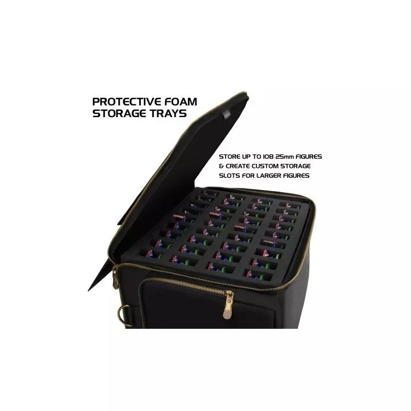 Conçue pour contenir jusqu’à 108 unités d’infanterie (jusqu’à 28 mm) et un certain nombre de figurines plus grandes, elle vous permettra d’emmener facilement votre armée à votre prochain événement de jeu.