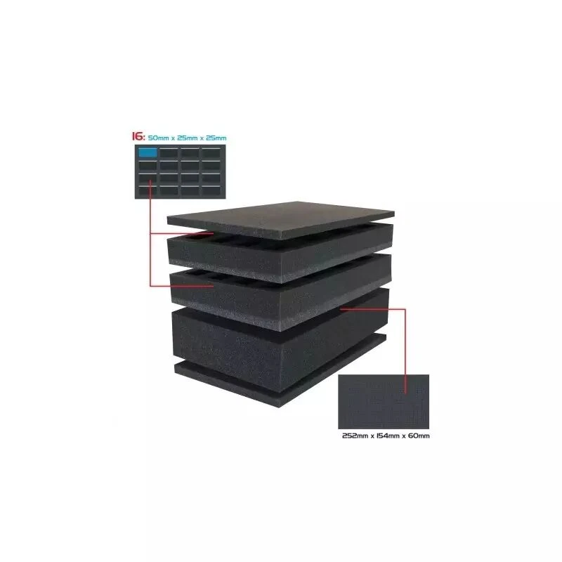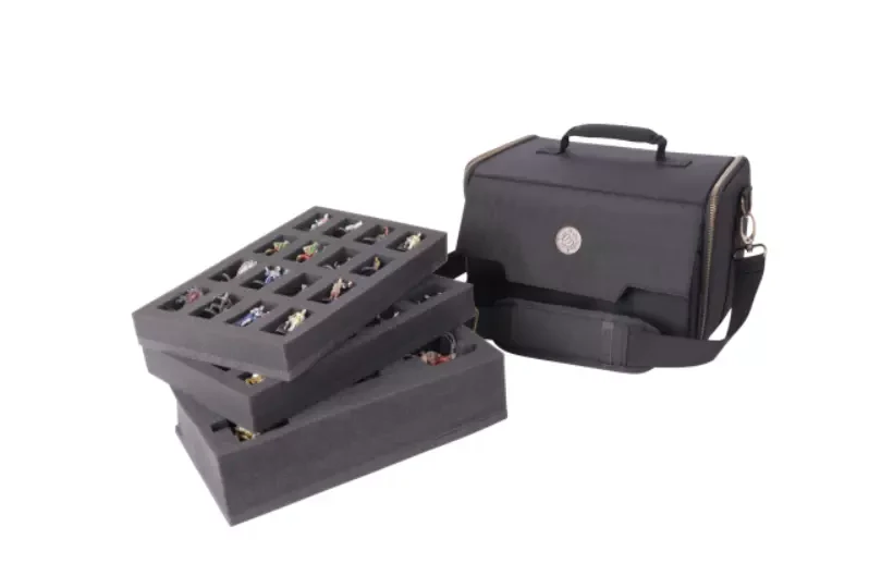 Il comporte 3 plateaux en mousse pour ranger et protéger vos figurines en toute sécurité : deux plateaux à 16 emplacements pour les figurines de taille standard (20 à 25 mm), et un plateau personnalisable de 60 mm d’épaisseur pour les figurines plus grandes ou irrégulières.
