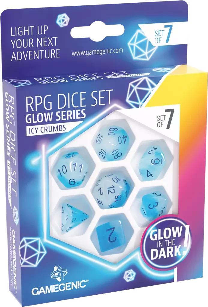 Ce set de dés contient un D4, un D6, un D8, deux D10 (10 et 00), un D12 et un D20. Les dés du set Glow brillent dans l’obscurité et ne laisseront pas la lumière s’éteindre lors de votre aventure. Ils sont emballés dans une boîte en carton à fenêtre qui présente tous les dés sur le devant.