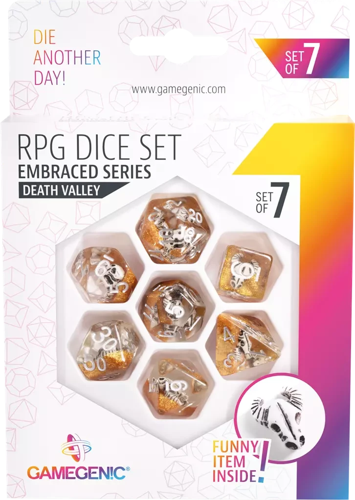 Ce set de dés contient un D4, un D6, un D8, deux D10 (10 et 00), un D12 et un D20. Tous les dés sont à coins ronds et contiennent un objet intéressant à l’intérieur pour un effet incroyable ! Ils sont emballés dans une boîte en carton à fenêtre qui présente tous les dés sur le devant.