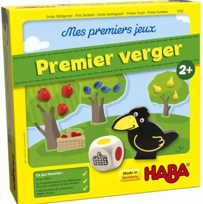 Les enfants parviendront-ils à cueillir ensemble les fruits avant que l’effronté corbeau Théo n’atteigne le verger ? Le dé indique que l’on cueille un fruit ou que le corbeau futé s’approche. Le lancer du dé et le classement stimulent une première reconnaissance et la désignation des couleurs, des formes et des symboles et apprennent à comprendre une règle du jeu basique. Par ailleurs, les gros fruits en bois faciles à saisir invitent au jeu libre et conviennent parfaitement aux mains des bambins.