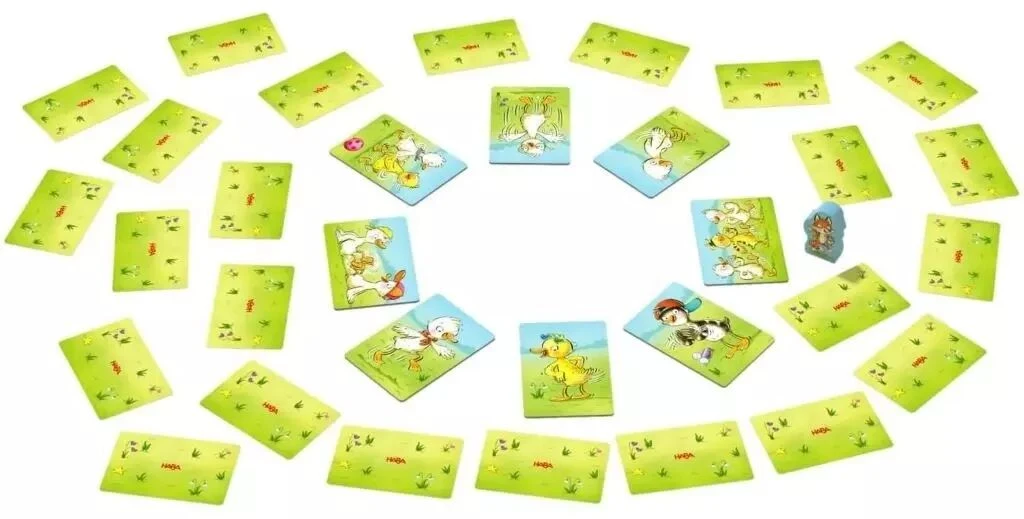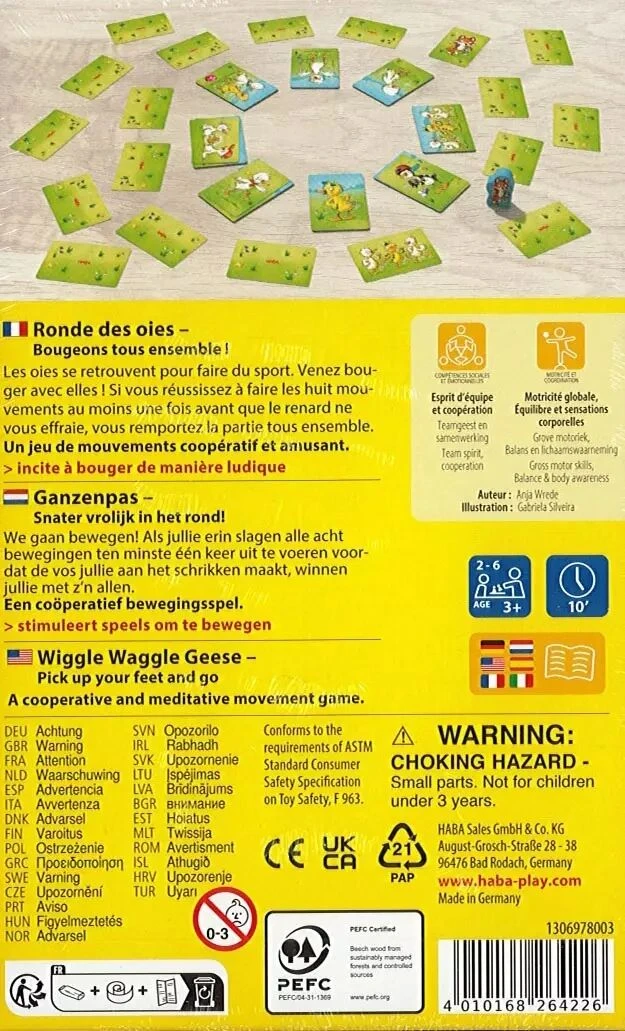 Le programme est représenté par 8 cartes, posées en rond, montrant chacune un des mouvements avec une ou plusieurs oies. Les autres cartes sont posées autour, cachées, et représentent soit un de ces mouvements, soit le renard. Lorsqu’on tirera une carte de mouvement, il faudra réellement l’effectuer seul ou à plusieurs.
