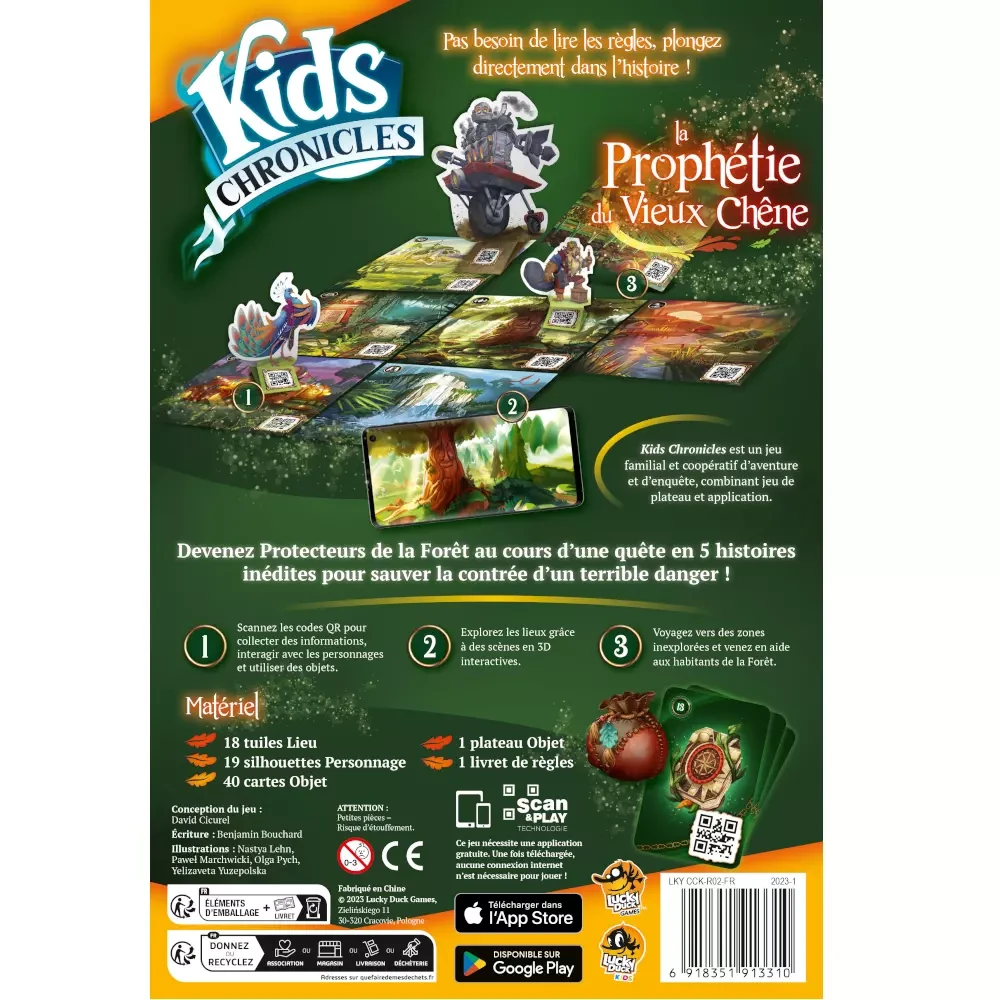Kids Chronicles est un jeu d’aventure et d’enquête, familial et coopératif, combinant un jeu de plateau à une application mobile. Chaque scénario propose une aventure unique. L’histoire se développe au fur et à mesure que vous collectez des objets et discutez avec les personnages que vous rencontrez en chemin. Chaque histoire terminée vous permet d’obtenir une Amulette. Une fois que vous les aurez récupérées toutes les quatre, vous pourrez affronter la menace finale et sauver la Forêt !