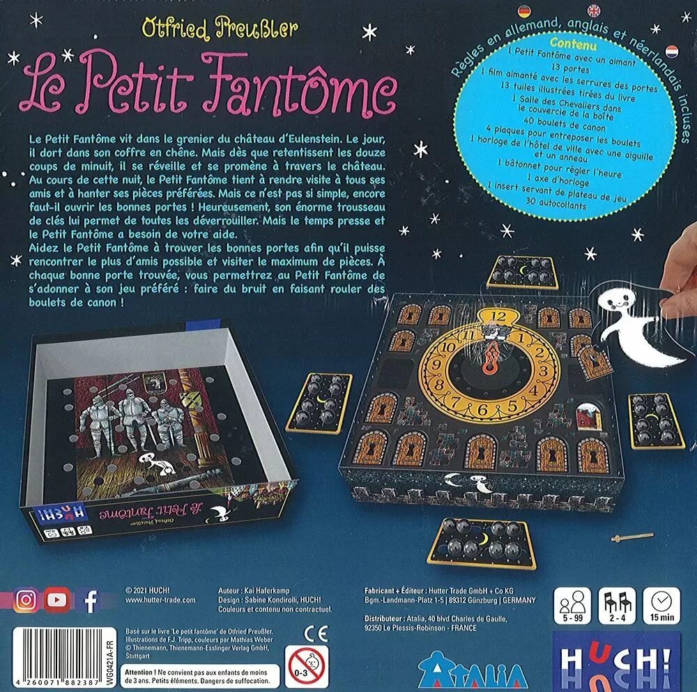 Quand vient ton tour, soulève les portes à l’aide de l’aimant que tient le petit fantôme pour dévoiler les images demandées. Tant que tu réussis, tu continues à jouer. Attention : il faut bien dévoiler les images dans l’ordre ! Si tu te trompes, ou si tu décides d’arrêter, tu lances autant de boulets de canon dans le couvercle que d’images bien trouvées. Pendant que les autres joueurs comptent 10 secondes, tu dois tenter de les placer dans les trous. Tous ceux qui sont bien placés sont défaussés dans la boîte, pour les autres, tu devras réessayer. Le premier qui se débarrasse de ses 8 boulets de canon ou qui enchaîne 6 images sans se tromper gagne la partie ! Le petit truc en plus : le trousseau de clés aimanté que détient le fantôme et qui permet d’ouvrir les portes.