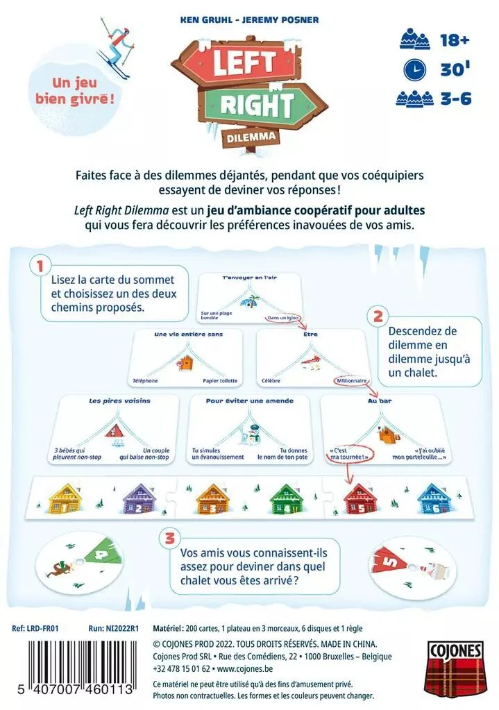 Une pyramide de 3 étages de cartes est constituée. Chaque carte pose un dilemme et propose deux réponses. Commencez par le sommet, votre choix vous renvoie vers l’une des deux cartes du dessous, qui elle-même vous enverra vers l’une des trois de la base. Enfin, la réponse à ce troisième dilemme vous amène dans l’un des 6 chalets du bas. Vos amis vous connaissent-ils suffisamment pour deviner lequel ?