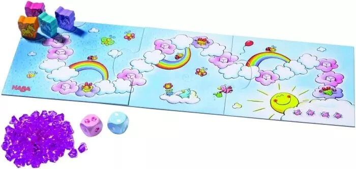 Les règles simples sont rapidement lues à voix haute et la course de dés commence aussitôt. Celui dont la figurine de licorne arrive en premier sur le nuage soleil et qui a ramassé le plus de cristaux de nuage en chemin remporte la partie de ce jeu soigneusement conçu.