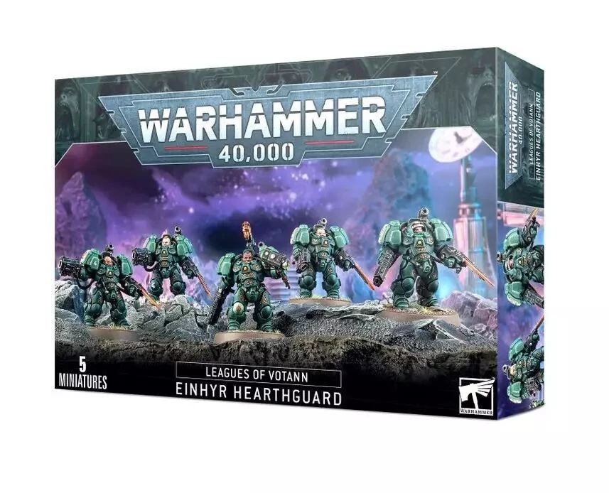 Ce kit plastique permet d’assembler cinq Âtregardes Einhyrs, des Cognats d’élite équipés des meilleures armes et armures à leur disposition. Les exo-scaphandres massifs et couverts de runes leur permettent d’encaisser les tirs concentrés de leurs ennemis, et incorporent un lance-grenade monté sur l’épaule. Chaque figurine peut être équipée de diverses armes de tir et de mêlée : un fusil à plasma EtaCarn ou un désintégrateur volkanite pour répandre la destruction à distance, et un gantelet à percussion ou un gantelet-lame à plasma pour les combats au corps à corps. Ce kit contient 19 têtes interchangeables : 12 têtes nues uniques, cinq casques et deux heaumes avec visière ouverte. Une figurine peut être assemblée comme chef Hesyr équipé d’un marteau à percussion et d’un cimier au choix parmi deux.