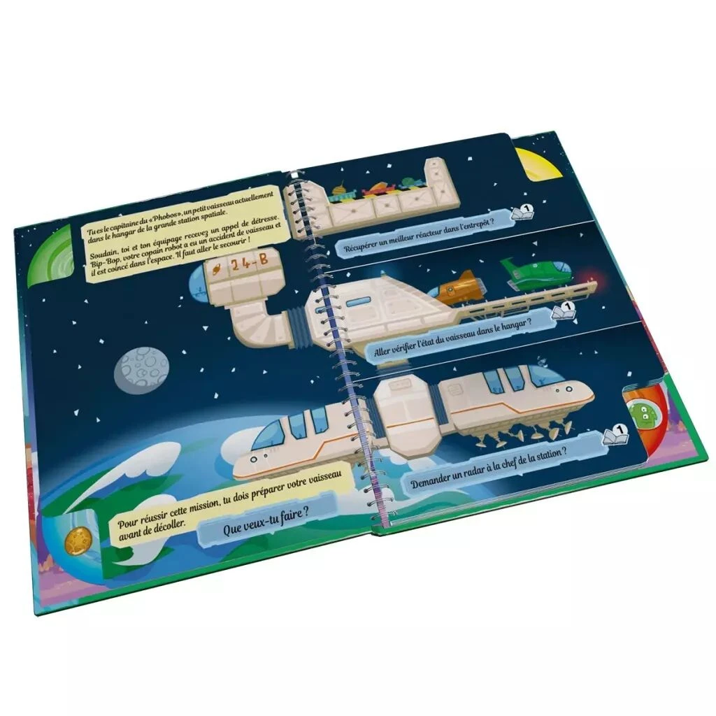 Et maintenant, ta mission spatiale peut commencer. Tu vas pouvoir lire ce livre normalement, de gauche à droite, mais rapidement, tu feras face à des choix matérialisés par des pages coupées en trois. Tourne la partie de ton choix et découvre ce qu’il va se passer. Après plusieurs choix, tu arriveras à la fin de ton aventure… Réussiras-tu à sauver Bip-Bop le robot ?