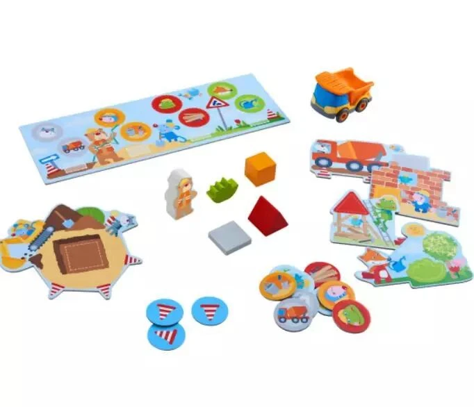 Contenu: 1 camion-benne Kullerbü, 1 chef de chantier l’ours Bruno, 1 plan de construction, 1 chantier, 4 éléments de construction en bois, 4 plateaux de dépôt, 12 plaquettes-cônes de chantier, 1 règle du jeu.
