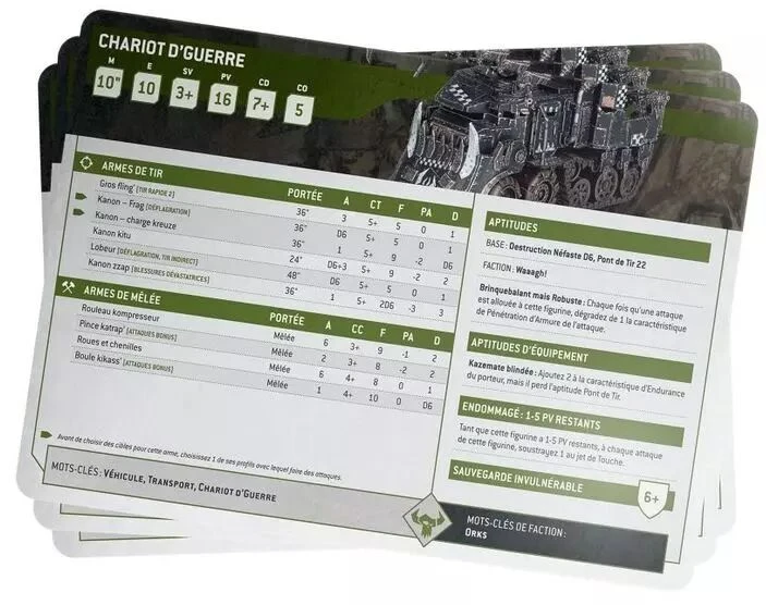– 57x Cartes de Fiche Technique orks: Chariot d’Guerre, Boyz Alpagueurs, Boss Dresseur, Boss Dresseur sur Squigosaure, Gros Mek en Méga-armure, Gros Mek avec Champ de Force Kustom, Gros Mek avec Kanon Shokk, Gro’Bunker d’Boss, Blitza-bomba, Chariot Boumdakka de lux’, Boss Snikrot, Boss Zagstruk, Boyz, Kram’boyz, Krama-bomba, Dakkajet, Dred eud’ la Mort, Trike Morkitu, Kopters d’La Mort, Frimeurs, Ghazghkull Thraka, Gorkanaute, Gretchins, Kariol’ Kichass’, Kap’tain’ Badrukk, Kariol’ Kitu, Boît’kitu, Kommandos, Boosta-klata Kustom, Pillards, Mad Dok Grotsnik, Méganobz, Brikojet Mégach’nillé, Mek, Kanons d’Mek, Atelier de Mekboy, Morkanaute, Mozrog Skragbad, Nob sur Squig Krazeur, Nob avec Bannière Waaagh!, Nobz, Médiboss, Médiko, Buggy Fourre-squigs, Dragsta Shokk, Boyz sur Squigliers, Krabouilleur, Chokboyz, Kass’tanks, Kamion, Motards de Guerre, Boss de Guerre, Boss de Guerre en Méga-armure, Klat’jet Wazboum, Bizarboy