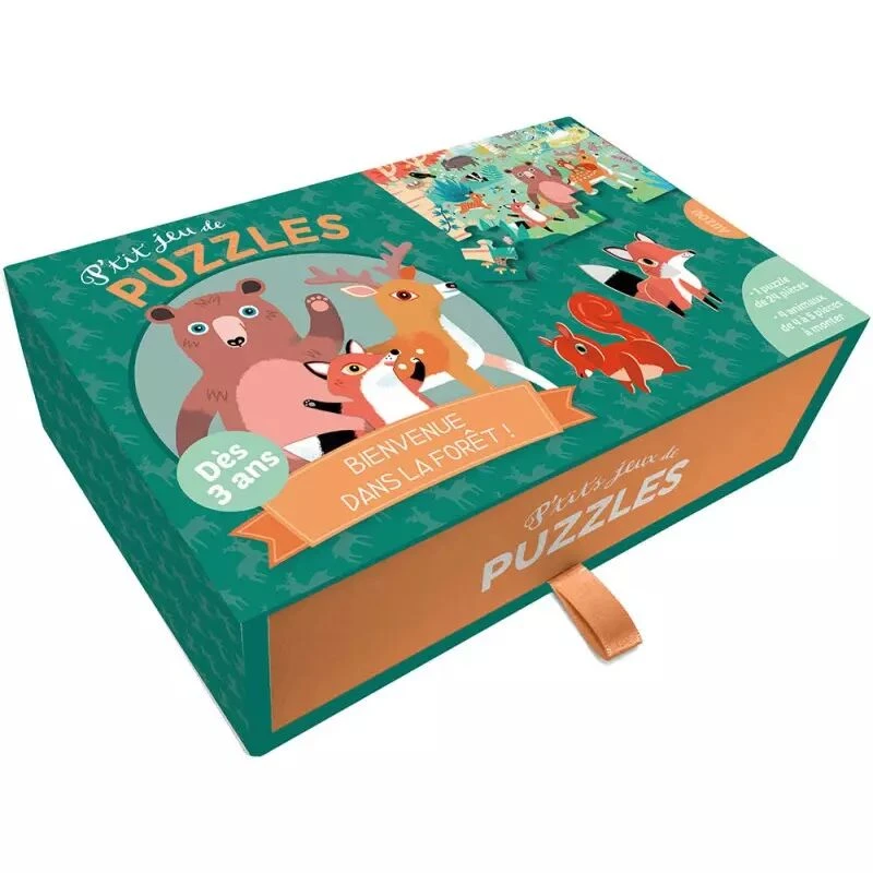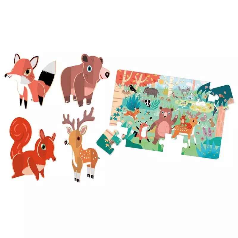 Découvre les animaux de la forêt avec ce ptit jeu malin : 1 puzzle de 24 pièces (et son modèle) et 4 personnages à monter en volume, pour jouer dans toutes les dimensions ! Un ptit jeu de construction et de motricité !
