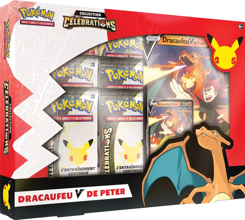 Ce coffret met à l’honneur le travail d’équipe entre Dracaufeu-V et son dresseur. Célébrez les 25 ans de Pokémon et retrouvez d’anciennes mécaniques de jeu du JCC Pokémon. Le Dracaufeu-V de Peter dispose de la célèbre attaque Lance-Flammes !