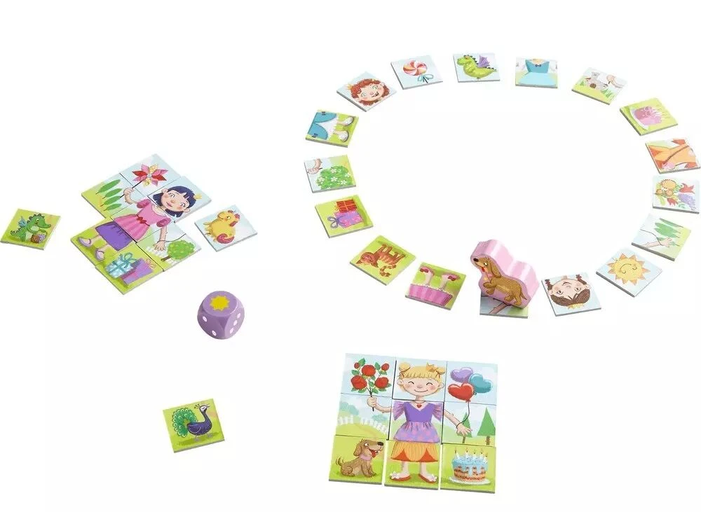 Qui veut bien aider le petit chien Charly à retrouver dans le jardin les princesses et les accessoires pour la fête ? Le premier enfant à réunir neuf pièces pour former un puzzle de princesse complet remporte la partie.