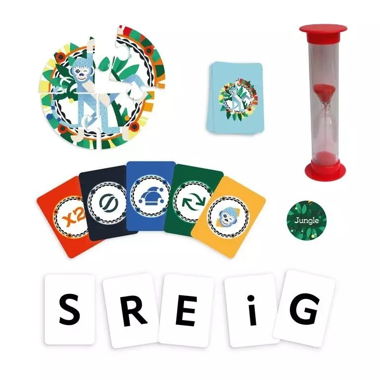 Pour remporter 4 quarts de singe, les joueurs posent des cartes avec des lettres chacun leur tour en s’assurant d’avoir toujours un mot en tête contenant ces lettres. En accusant un joueur de bluffer on peut remporter un quart de singe s’il n’a pas de mot ou lui faire gagner un s’il a un mot