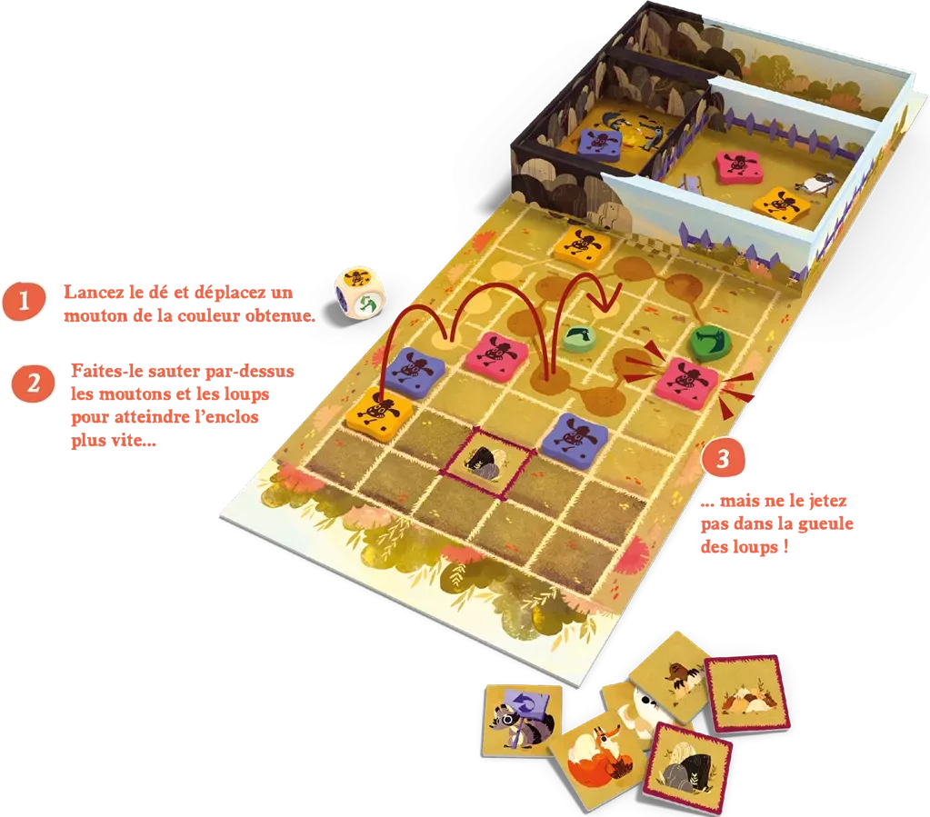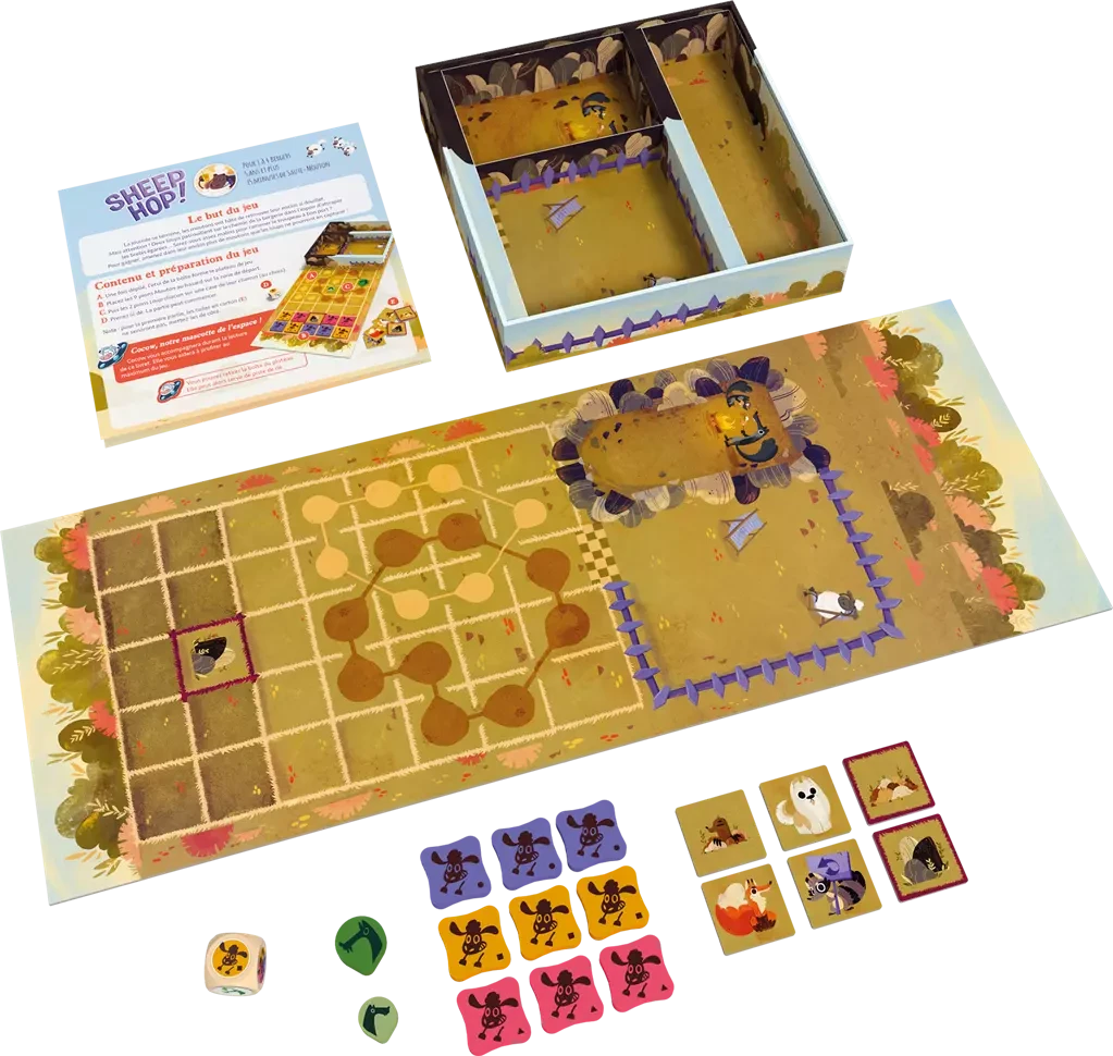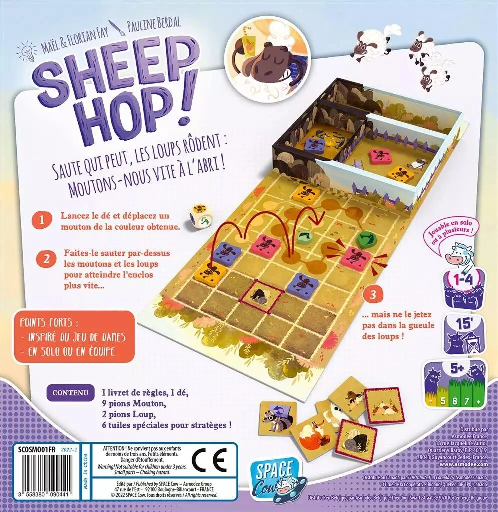 Des loups rôdent et il faut absolument ramener les moutons à la bergerie. Mais ce ne sont pas des moutons ordinaires, vite effrayés et qui courent n’importe où. Ce sont des moutons stratèges et de véritables athlètes. Ils sont capables de sauter les uns par-dessus les autres, pour atteindre leur refuge avant que les loups ne les attrapent ! Sheep Hop ! est un jeu pour les enfants (et leurs parents) qui s’inspire des règles du jeu de dames. En sautant les uns par-dessus les autres, les moutons échappent aux loups. Des tuiles spéciales pimentent les parties, qui se jouent vite. D’ailleurs, pour en commencer une, ouvrez la boîte : le plateau se déplie avec ! Ce jeu simple et addictif vous propose des règles pour y jouer seul ou par équipes, pour des soirées en famille pleines de (re)bondissements !