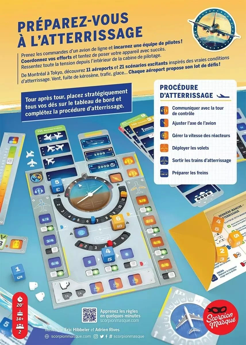 Pour rejoindre la terre ferme, les joueurs devront surveillez l’axe de l’avion, contrôler sa vitesse, déployer les volets, sortir le train d’atterrissage, contacter la tour de contrôle afin de réguler la circulation aérienne, et éventuellement, prendre un petit café pour améliorer leur concentration et modifier la valeur de leur dés.