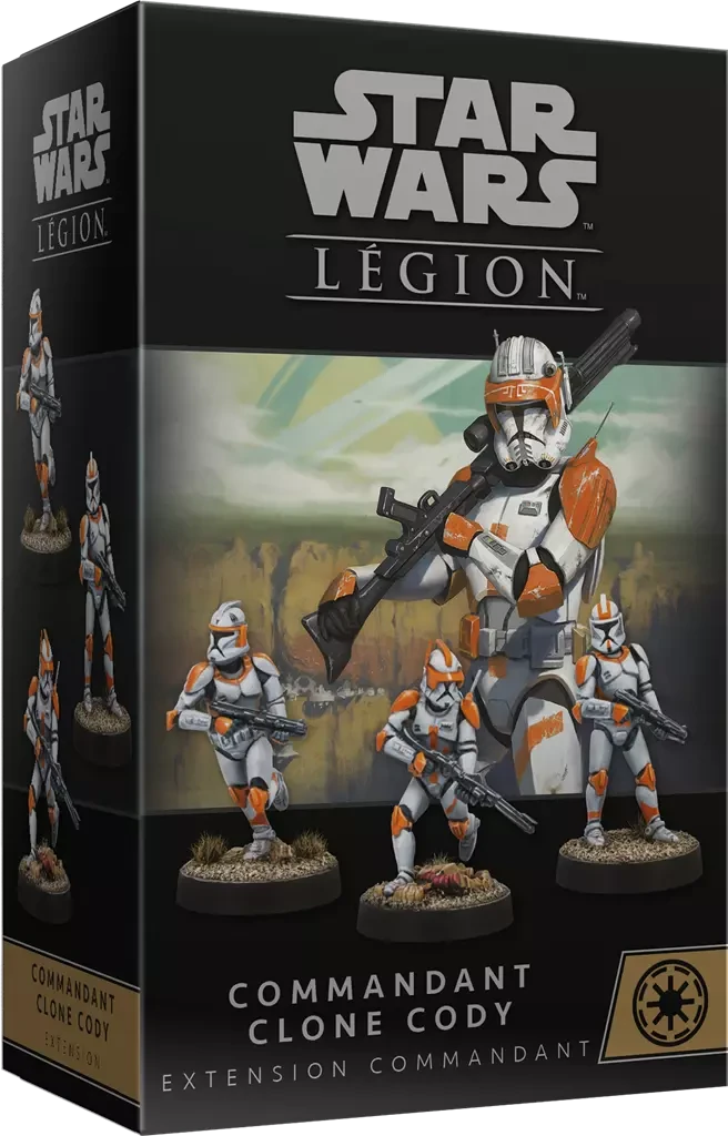 Cody peut être utilisé comme commandant dans la Grande Armée de la République. Il coûte 105 points et dispose d’un nombre respectable de capacités et d’options. Cody est un combattant de mêlée compétent, comme en témoigne son entraînement au combat avancé. Lorsqu’il attaque à distance, son fusil blaster DC-15A lui donne un nombre respectable de dés d’attaque : 2 rouges, 1 noir et 1 blanc, ainsi qu’Impact 1 et Létal 1. Capable de commander une bataille à son point le plus crucial, Observer 2, Se mettre à couvert 1 et Diriger : Véhicule sont des capacités qui reflètent ses prouesses en tant que commandant du 7e corps du ciel. Enfin, son expérience du combat et son équipement lui donnent accès à Cible 1 et Surge : Critique, Saut 1 et Dés de défense rouge.