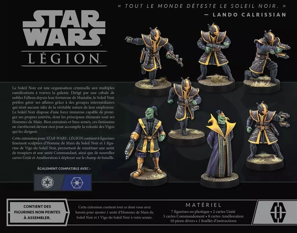 Cette extension invite les joueurs à embaucher six hommes du Soleil Noir supplémentaires qu’ils peuvent ajouter à leurs forces impériales, séparatistes ou le Collectif de l’Ombre en tant qu’unité corps.