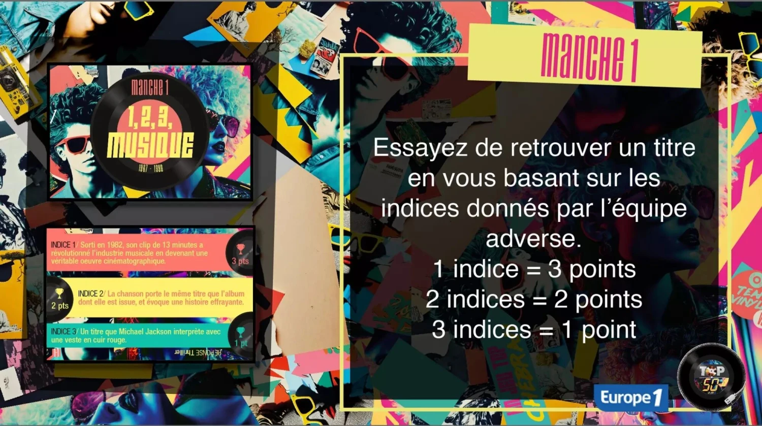 Manche 1 : L’équipe adverse tente de vous faire deviner un titre grâce à trois indices. Si vous devinez le titre au premier indice, c’est 3 points, au deuxième indice c’est 2 points, et enfin 1 point s’il vous a fallu tous les indices.
