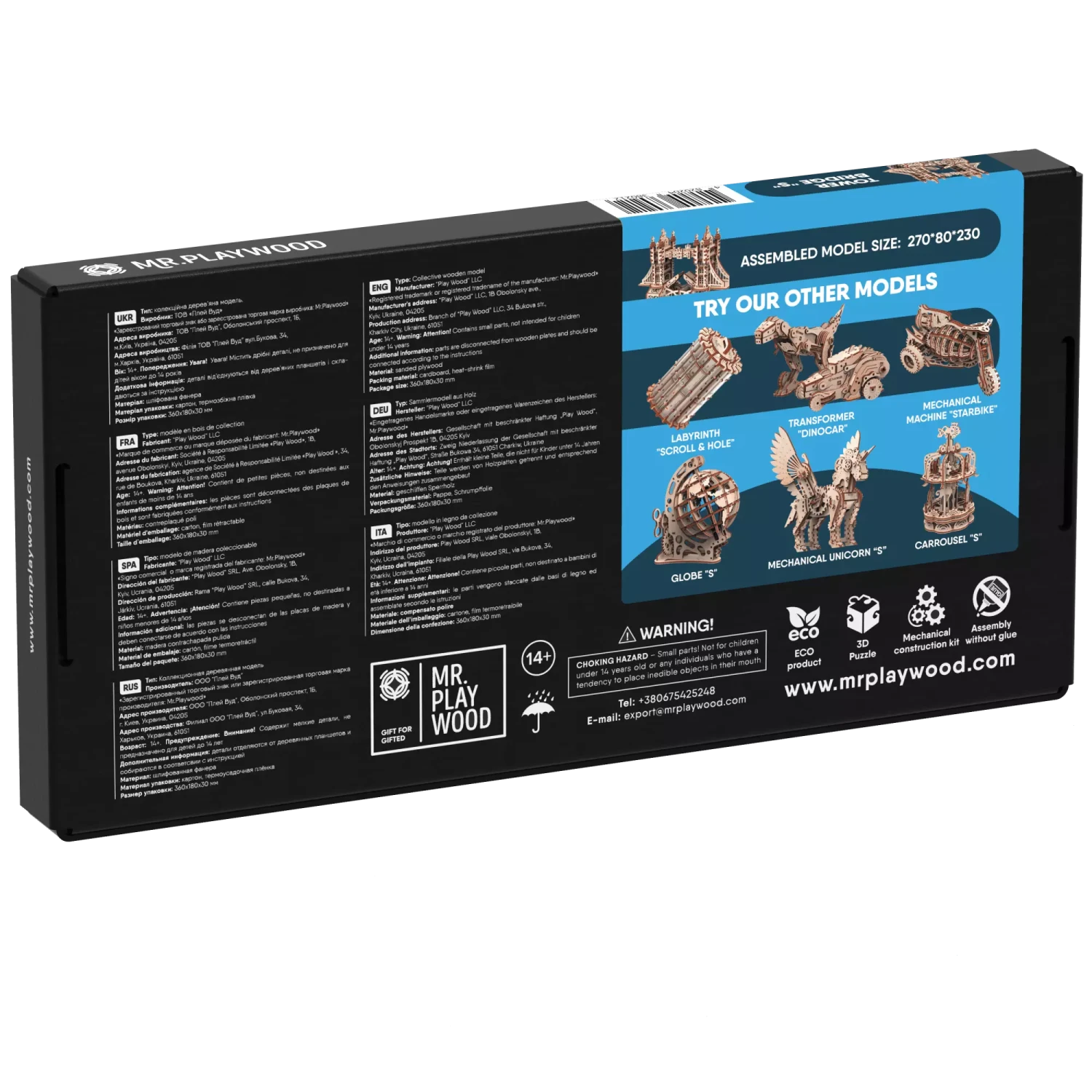 Ce jeu de construction peut être assemblé sans colle, la boîte contient tout ce qu’il vous faut dont un outil universel qui peut être utilisé pour dégager les pièces des planches sans les abimer, de monter les engrenages sur les axe et effectuer des mesures.