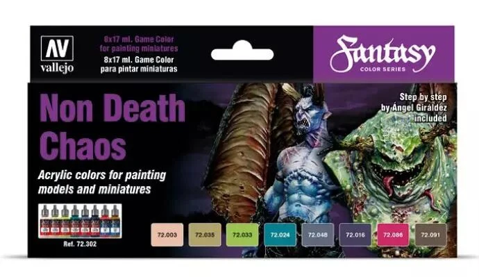 Nouvelle présentation du set Non Death Chaos, maintenant avec des instructions étape par étape de la peinture avec des photographies de Angel Giraldez. L’ensemble contient 8 Game Colors pour peindre les miniatures des fantômes, zombies, monstres, vampires, démons et autres maligne créatures de la nuit. (72003) Peau pâle, (72016) Mauve royal, (72024) Turquoise, (72033) Vert, (72035) Peau morte, (72048) Gris sombre, (72086) Rouge, (72091) Sépia.